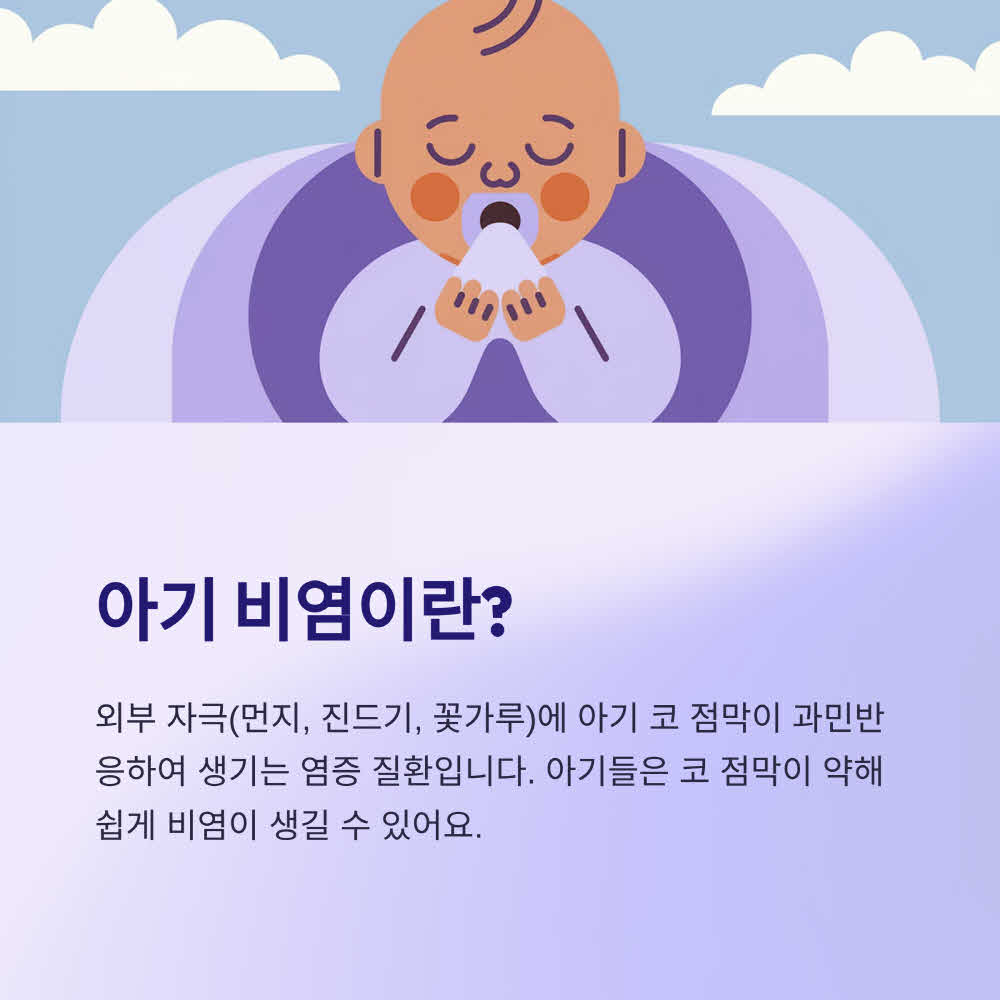아기 비염은 외부 자극(먼지, 진드기, 꽃가루 등)에 아기 코 점막이 과민반응하여 생기는 염증 질환입니다.