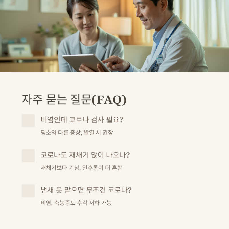 특히 비염 환자라도 평소 증상과 다르면 검사가 안전합니다.