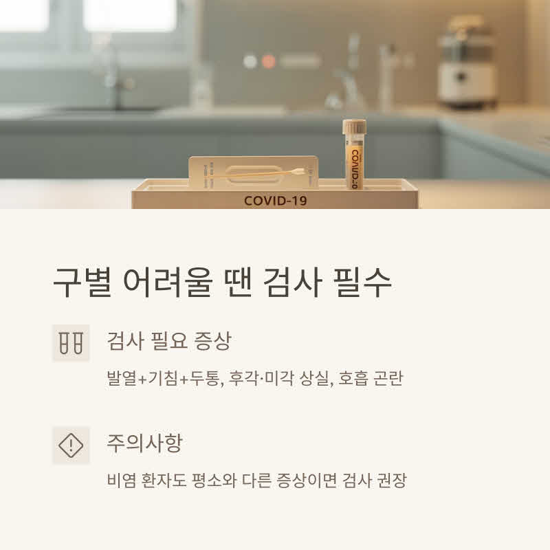 평소와 증상이 다르거나 발열·몸살 동반 시 검사를 권장합니다.