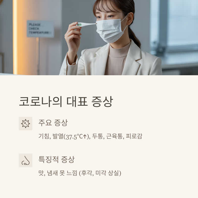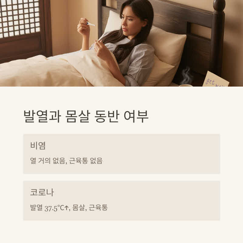 👉 코로나는 발열 + 몸살 + 후각·미각 상실이 동반되기 쉽습니다.