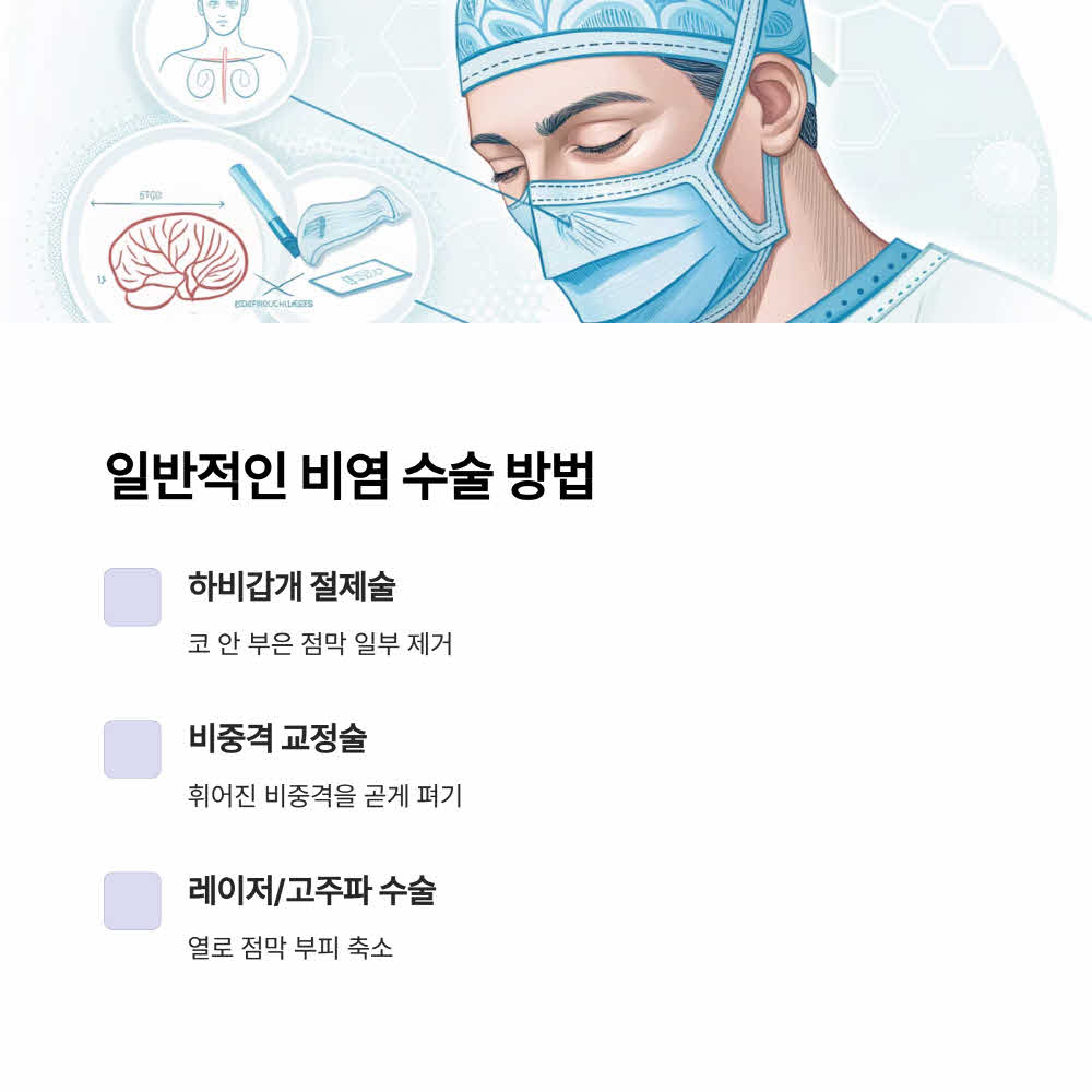 - 비중격 교정술: 휘어진 비중격을 곧게 펴서 공기 흐름 개선