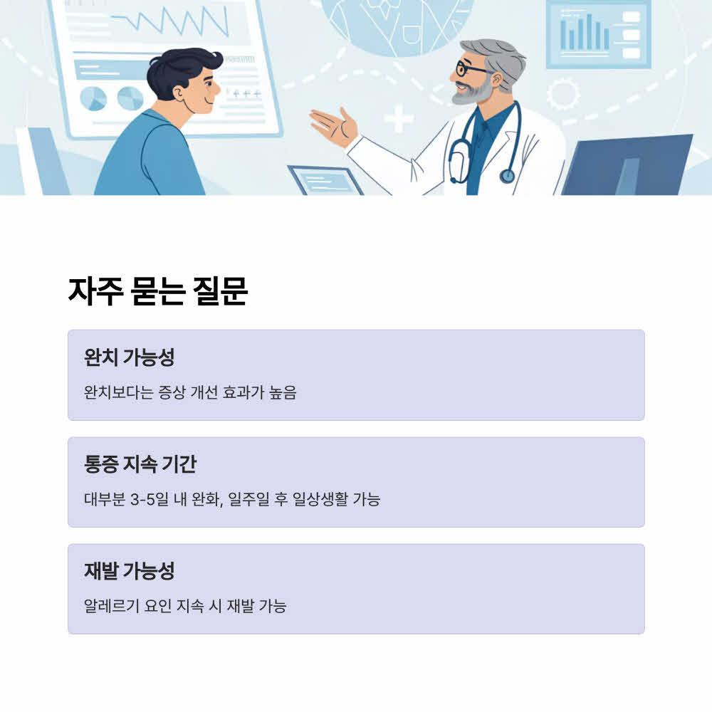 완치는 어렵지만 증상 개선 효과는 매우 높습니다. 다만, 알레르기 원인이 계속된다면 다시 악화될 수도 있어요.