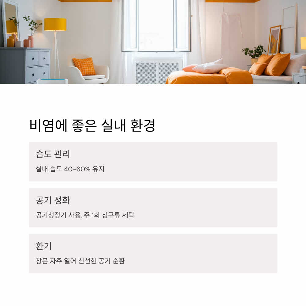 - 먼지, 진드기 등 알레르기 유발 물질 피하기